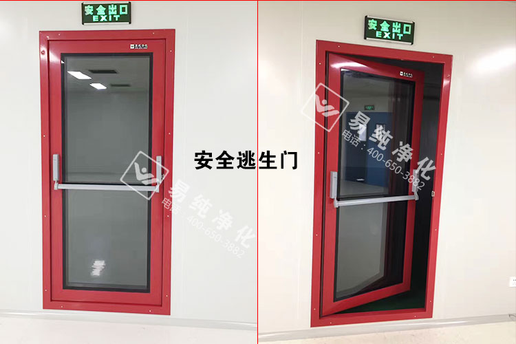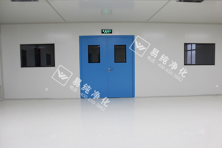 車間內部全部采用A1級凈化板材,芯材為琉陽鎂芯材凈化板,地板采用LG品牌PVC防靜電地板,墻體設置安全門,此安全門為易純專業定制摁壓式安全門,全透明鋼化玻璃,也是此次工程的一大亮點。頂部采用48W超薄型LED燈具,吸頂安裝,既美觀又節能。傳遞窗采用雙層中空門,門體嵌入式安裝,內底部圓弧設置無死角。門窗全部采用雙層中空窗及鋼制成品門,帶德國多瑪閉門器。